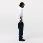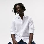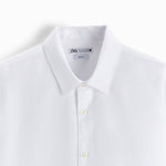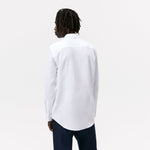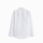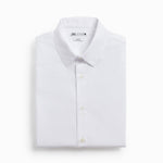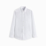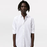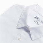 Slim fit spread collar shirt featuring long sleeves with buttoned cuffs. Button-up front.