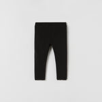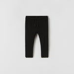 Leggings featuring an elastic waistband with front ties. Lace trim on the hems.