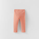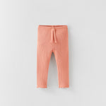 Leggings featuring an elastic waistband with front ties. Lace trim on the hems.