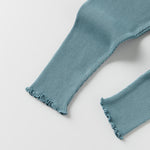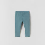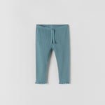Leggings featuring an elastic waistband with front ties. Lace trim on the hems.