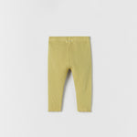 Leggings featuring an elastic waistband with front ties. Lace trim on the hems.