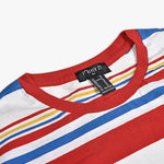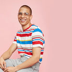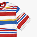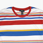 2. This cotton knit tee features a horizontal striped pattern, short sleeves, and a crew neck.