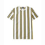 A knit tee featuring an allover striped pattern, crew neck, and short sleeves.