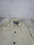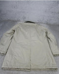 Descriptions: Suede leather jacket with a white faux shearling interior. Featuring a lapel collar, long sleeves, welt pockets at the hip, an inside pocket and a zip-up front. Hip welt...